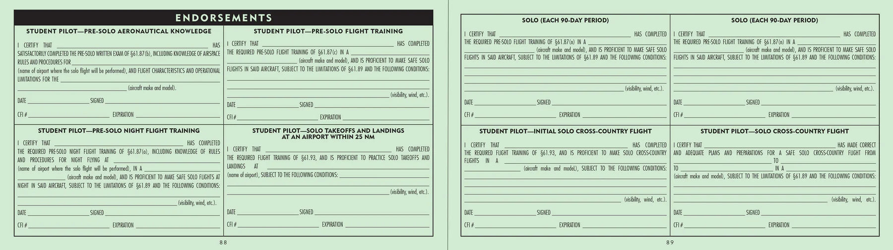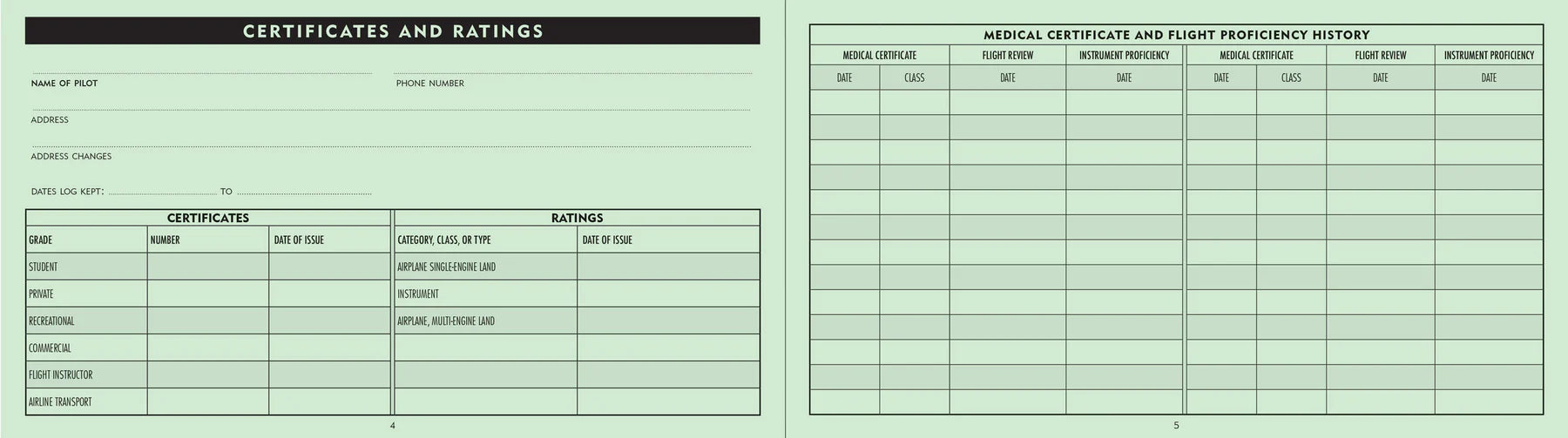 Includes places to record certificates and ratings, medical certificate and flight proficiency history, endorsements, and more.