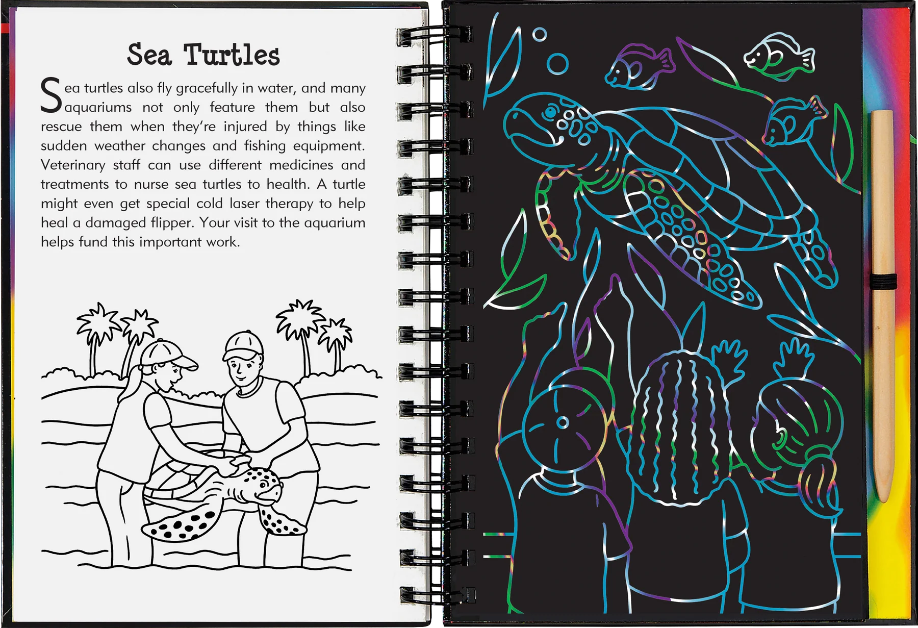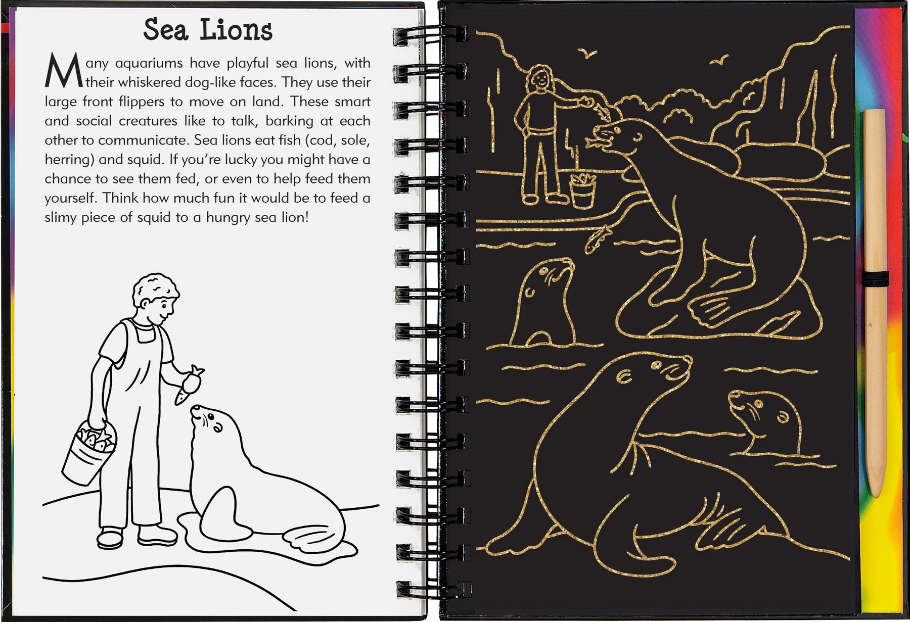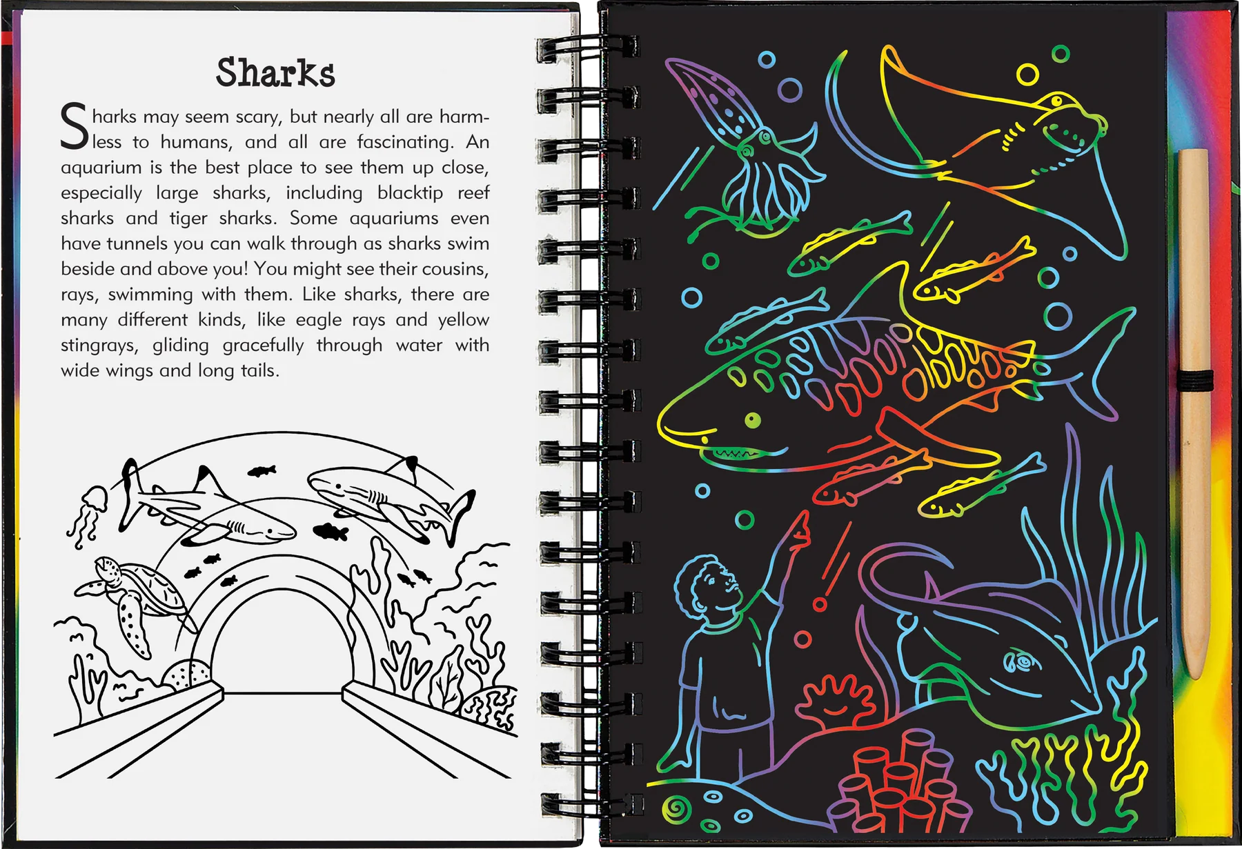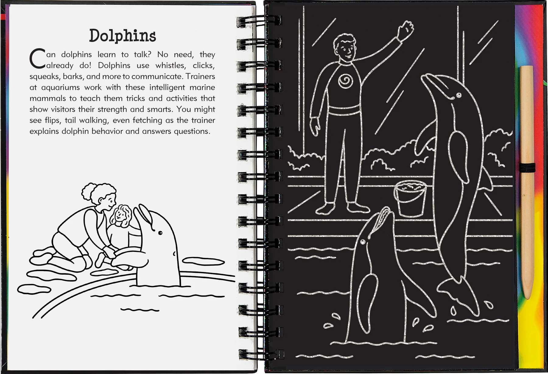 • Art activity book contains 20 black-coated scratch-off pages, 20 illustrated pages with informative text, and 20 pages for independent drawing.