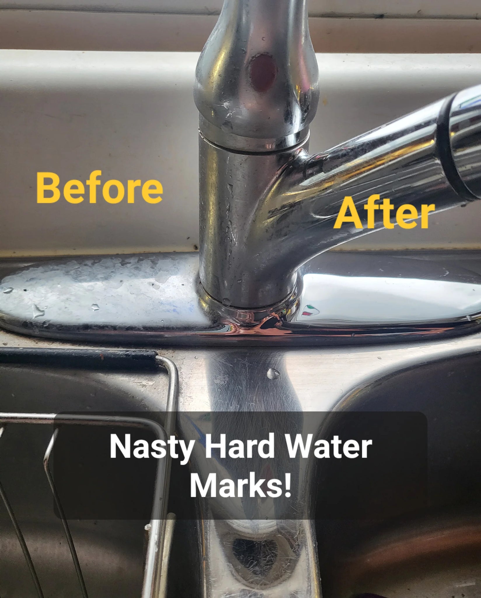 ✔︎ Good-Bye Hard to Remove Grime It gets rid of lime scale, hard water marks, grease, burnt stuff on your pots and pans, soap scum, shower doors, sinks & tubs, chrome faucets, scuffs on your running shoes, tough dirt on your golf clubs, dead bugs and dirt on your garden furniture, outdoor toys & windshields - even removes those nasty tree sap droplets on your outdoor furniture and vehicles!  It will not scratch surfaces!