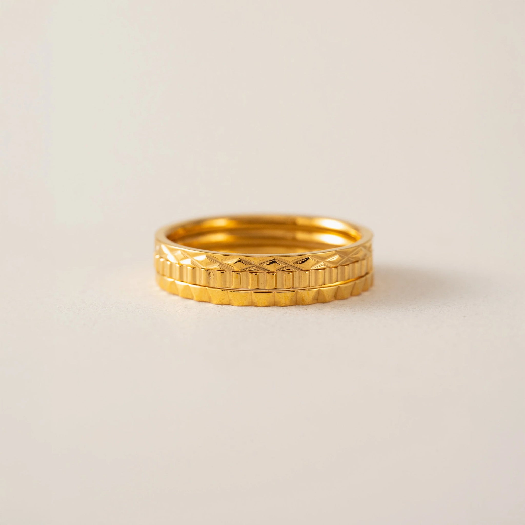A set of light-catching textured rings to elevate your ring stack. Made with PVD and stainless steel, you can wear these waterproof rings anywhere.