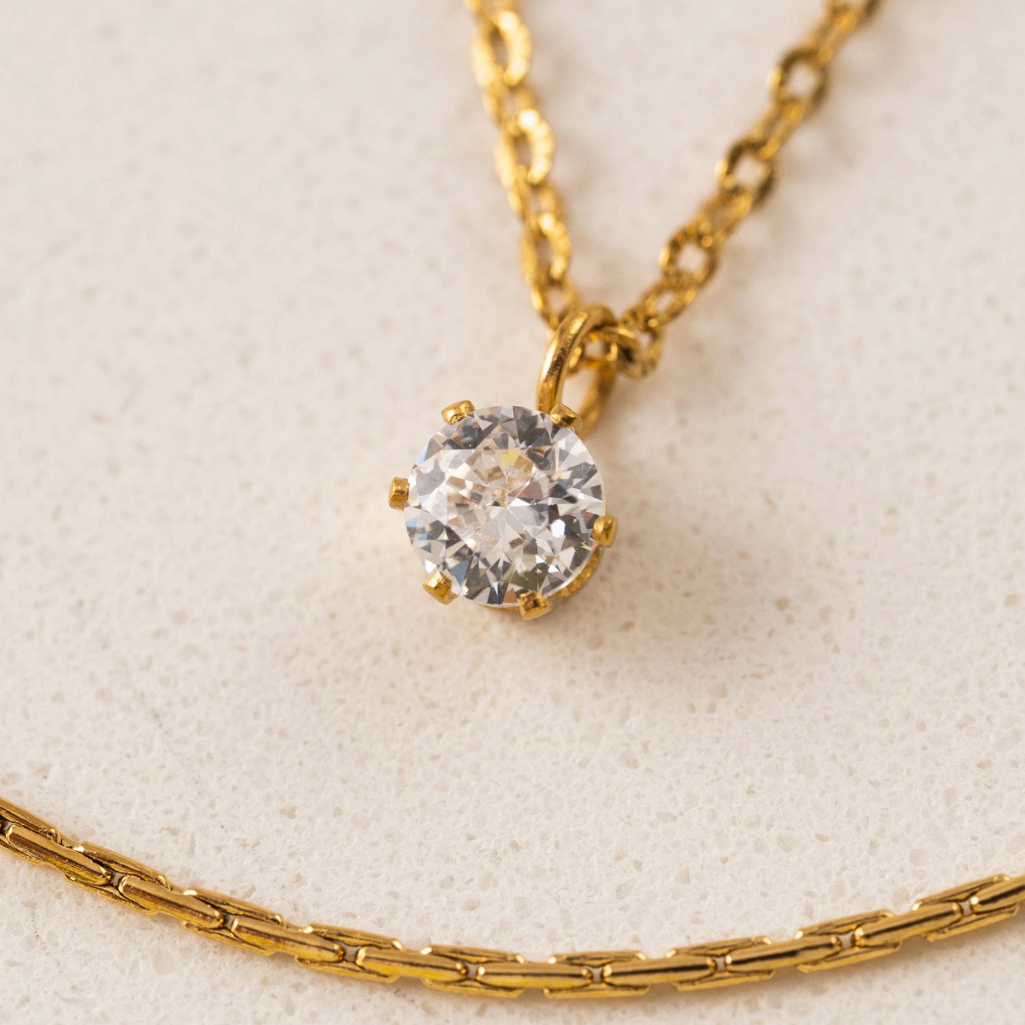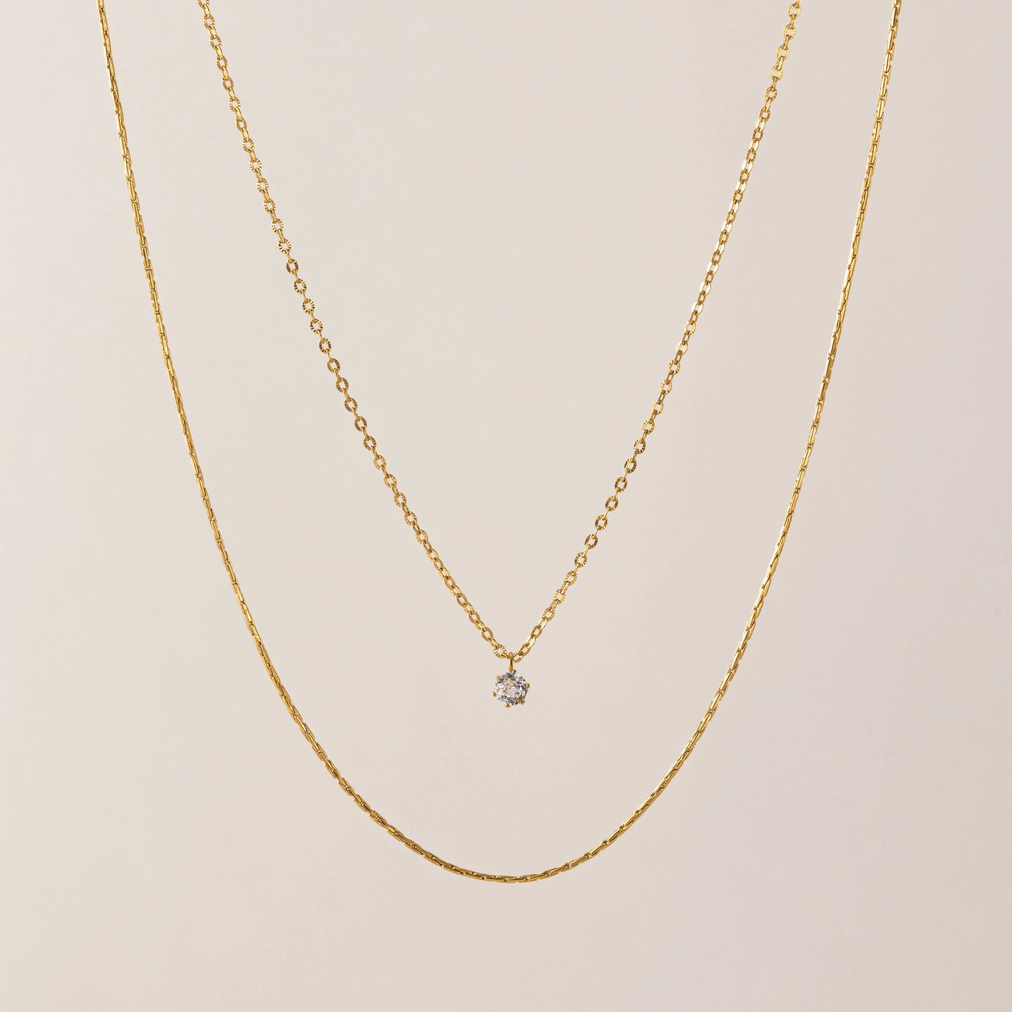 Elegant enough for everyday wear, but with a touch of luxe. This delicate layered chain necklace features a single cubic zirconia pendant, adding just the right amount of sparkle to any outfit. Brilliant cubic zirconias set in sleek stainless steel & 18K Gold-PVD.