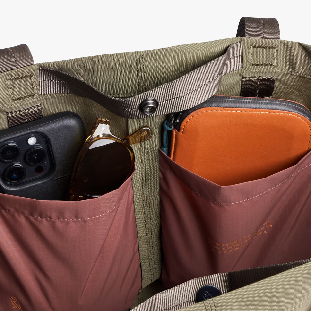 This tote is made from 100% recycled plastic water bottles. It is leather-free.
