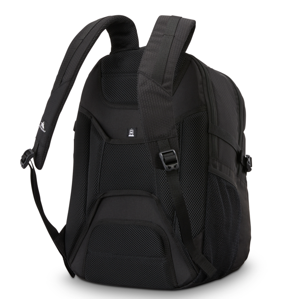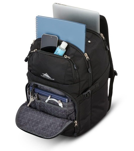 The HS Pendall backpack has a padded top carry handle, padded backpack straps and air mesh backing, side compression straps, integrated luggage pass-through, mesh water bottle pocket and 2 zippered front pockets. The bottom pocket includes tablet sleeve, organization pockets, and key leash. The interior has a front compartment, large main rear compartment with a soft-lined sleeve that fits laptop up to 15” and space for binders, files, etc.