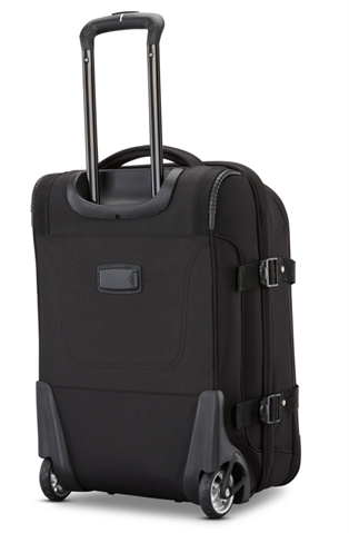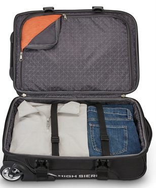 The Pendall Carry-On wheeled duffle has bale carry handles with velcro wrap, front zip pocket, padded top carry handle, push button pull handle, discreet ID tag on the back of the duffle, side compression straps, oversized wheels with treads and bottom grip handle. The interior has a large main compartment with zippered access to bottom compartment and drop bottom compartment with compression straps.