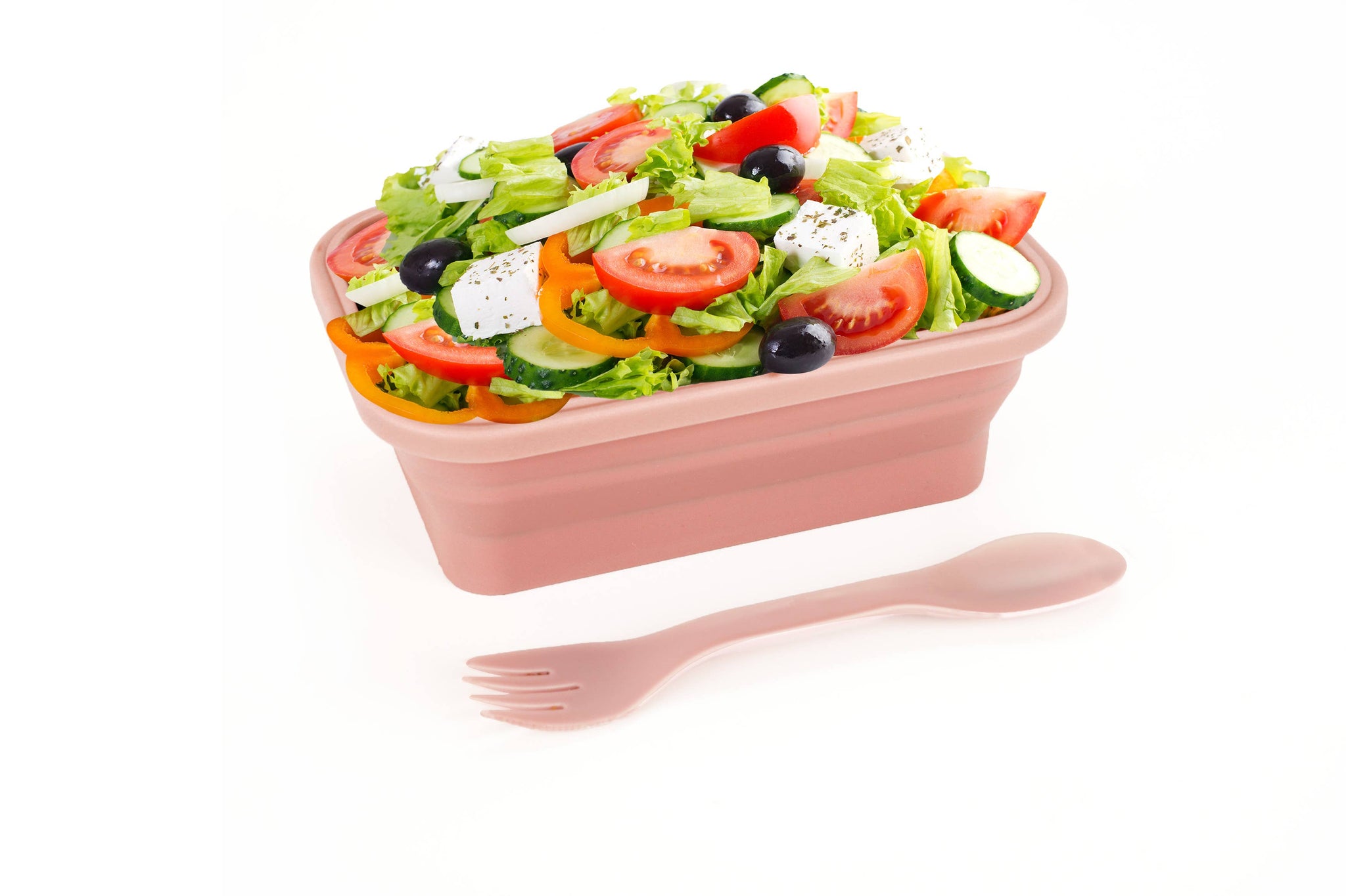 Pantry-approved collapsibles for the perfect meal on-the-go! These store-flat silicone meal containers hold over 3 cups of food and include a reusable snap-in fork/spoon utensil. Sure-fit lid keeps food fresh and secure for lunches, leftovers and late night snacking. Pop - Fill - Go! -Snap-in reusable utensil -BPA-free -FDA-approved -Dishwasher & microwave safe -Storage volume: 27.1 oz (800 ml) -Travel & eco-friendly silicone -Sure-fit lid keeps food fresh and secure -Collapsible design instantly saves storage space.