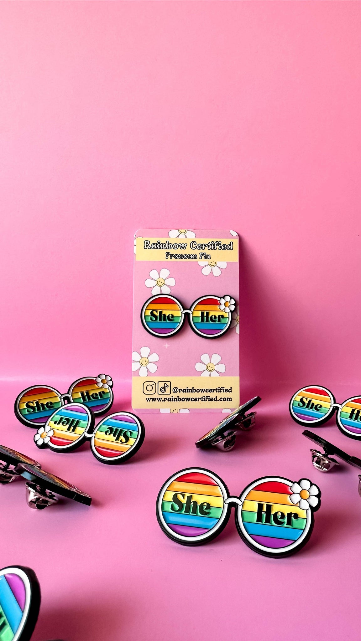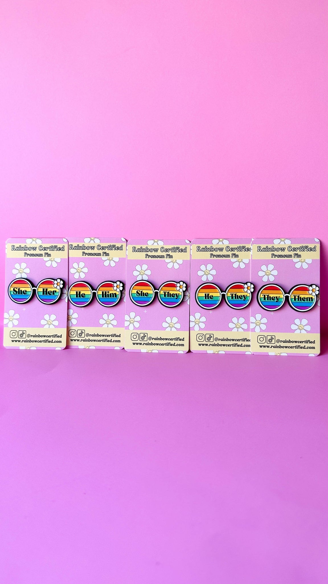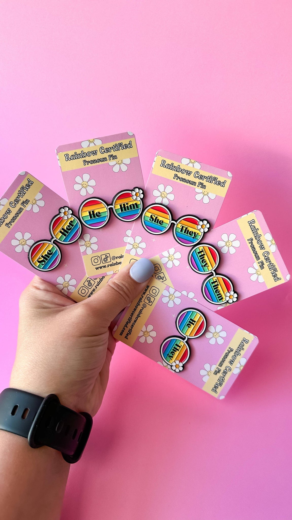 70's Rainbow Glasses Pronoun Pins: He/ Him