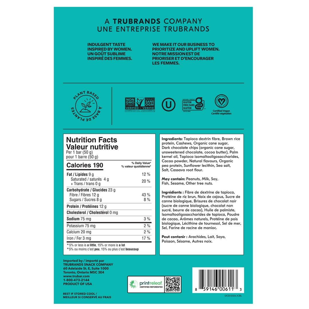 Ingredients: Tapioca Fiber and Cassava Blend, Plant Fueled Protein Blend (Whole Grain Rice Protein, Organic Pea Protein), Cashews, Cane Sugar, RSPO Palm Oil, Unsweetened Chocolate, Cocoa Powder, Natural Flavors, Sunflower Oil, Cocoa Butter, Sea Salt, Sunflower Lecithin