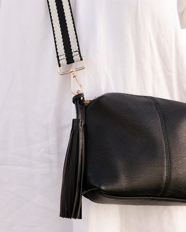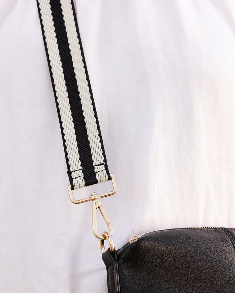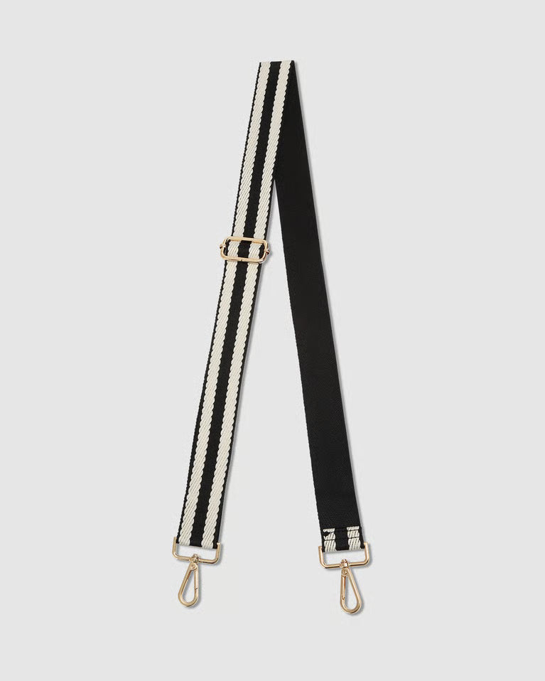 The Louenhide Stripe Webbing Bag Strap is a sporty, yet classic accessory that will never go out of style. This simplicity of the stripe design makes this guitar strap versatile, adding a level of effortless style with the textured webbing finish. Embellished with beautiful light gold hardware and made to be adjusted to your desired length, this strap is a must have to mix and match.