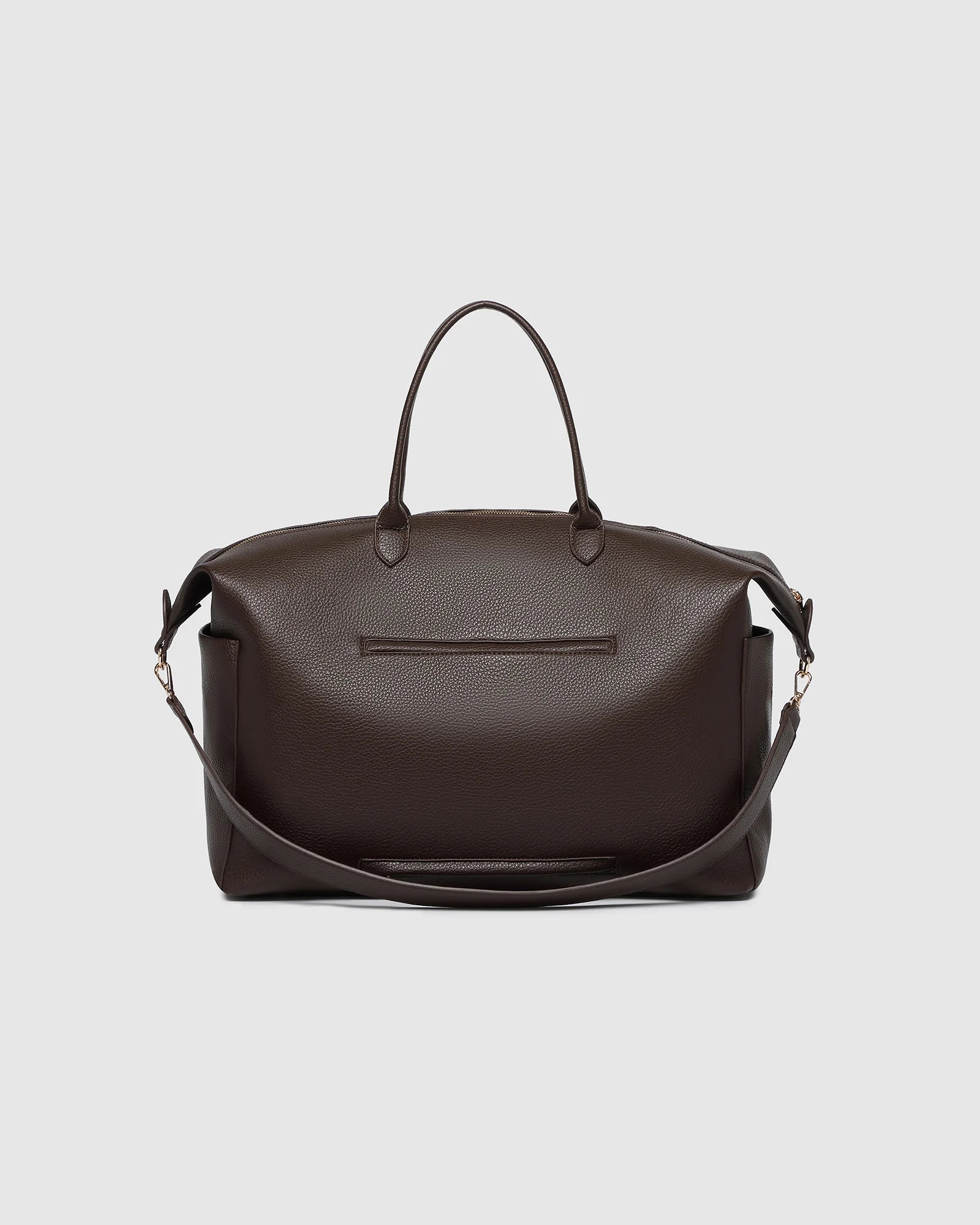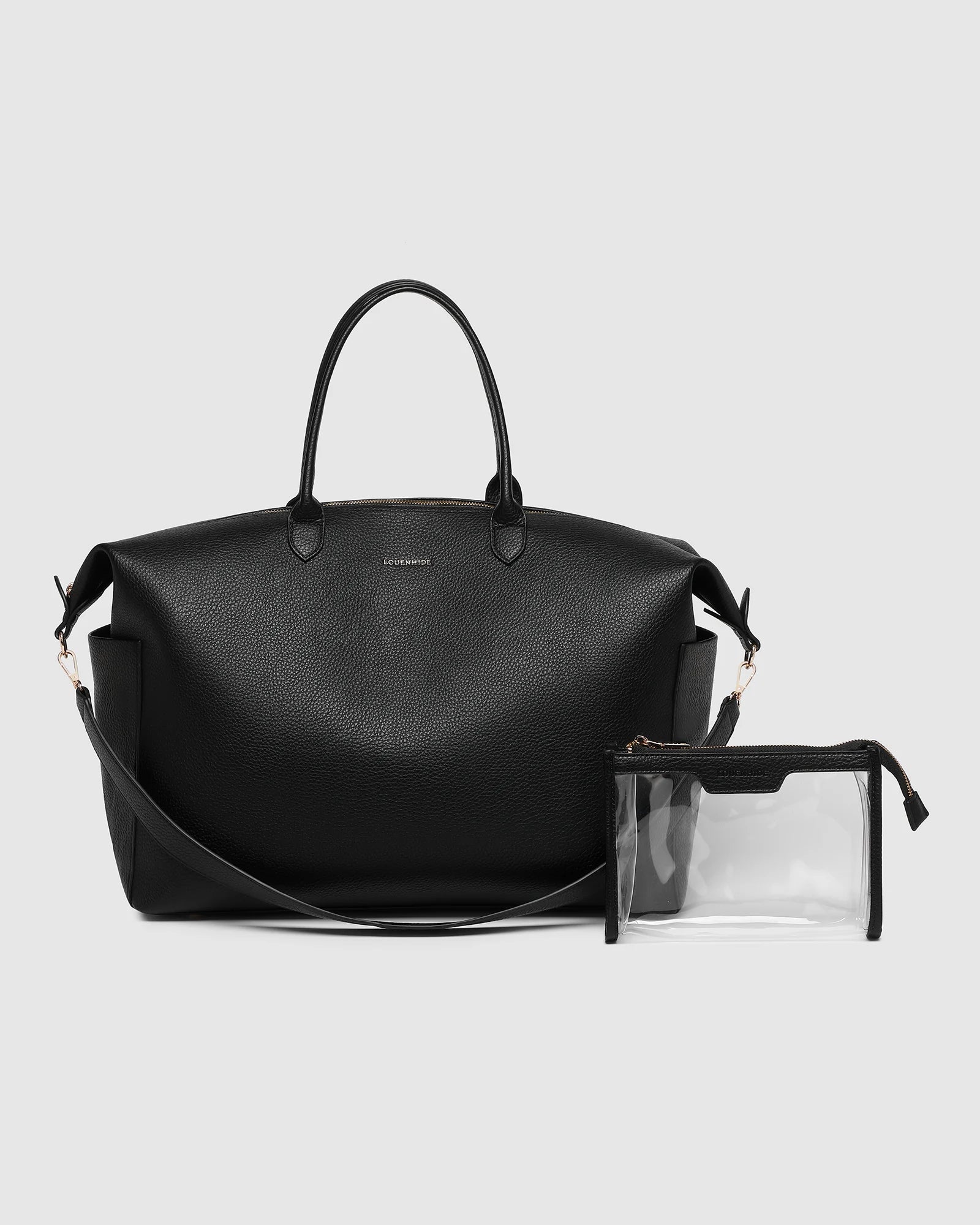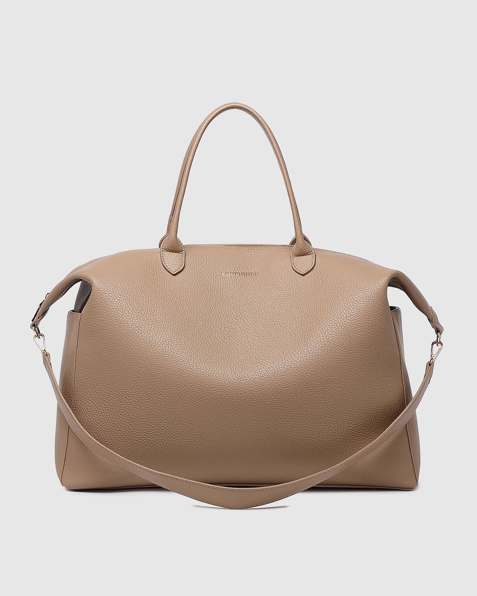 The Louenhide Ohio Overnight Bag is the ideal travel carryall for holidays or business trips. Designed with a compact, rectangular silhouette, this sleek women's overnight bag is perfectly sized to fit in overhead luggage compartments. Featuring luxe, smooth vegan leather, a spacious interior with a secure zip closure, and two external slip pockets on each end, this women's travel bag is both stylish and functional. The also comes with a clear plastic pouch to secure your cosmetics and prevent leaks. With three ways to wear, carry this classic unisex overnight bag by the long top handles, over the shoulder with the detachable crossbody strap, or hands free with the hidden trolley sleeve effortlessly slipped over your suitcase handle.